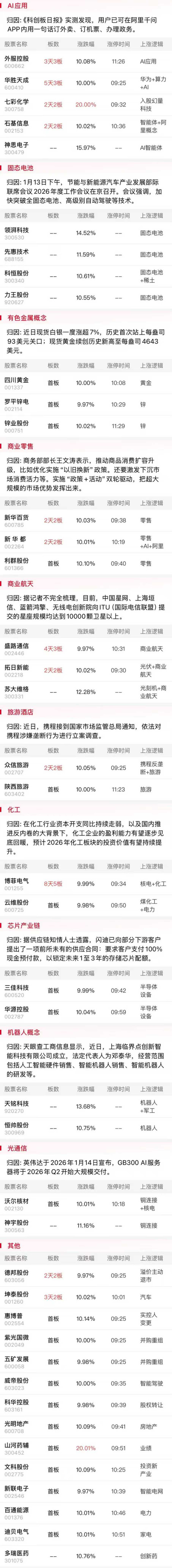 综合来看,今日早盘市场震荡调整,三大指数全线下挫,量能大幅萎缩。其中有色金属板块震荡走高,旅游、锂电等方向逆势活跃。而商业航天与AI应用两大热门赛道集体调整,相关高位人气股更是遭遇跌停潮,短线情绪降温明显。但市场中期震荡向上的趋势不会轻易改变,故应对上保持耐心,静待短期风险充分释放后再行寻找低吸机会。